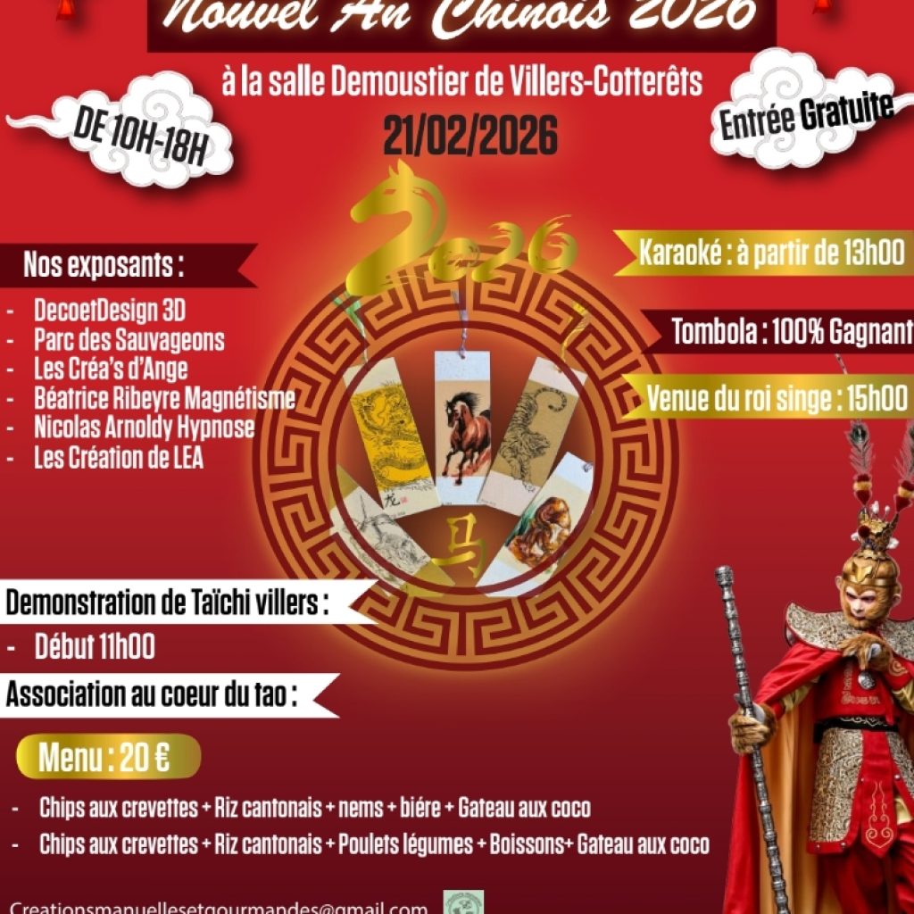 Nouvel an chinois 2026 03.02.2026 par CHRISTINE À noter : 2 évènements pour fêter le Nouvel an chinois organisés par les associations Tai Chi Chuan / Qi Gong de Wasquehal et Taichi Villers.Ils seront subventionnés par le comité régional Ffaemc Hauts-de-France suite à l’envoi de leur dossier de demande de partenariat.Retrouvez-les, le dimanche 15 février à Wasquehal et le samedi 21 février à Villers-Cotterêts.
